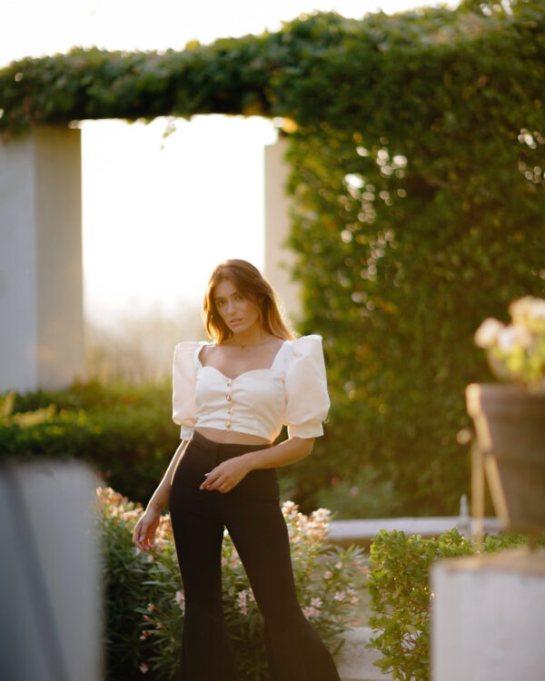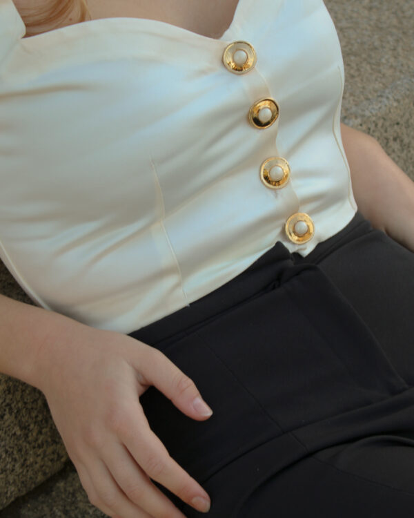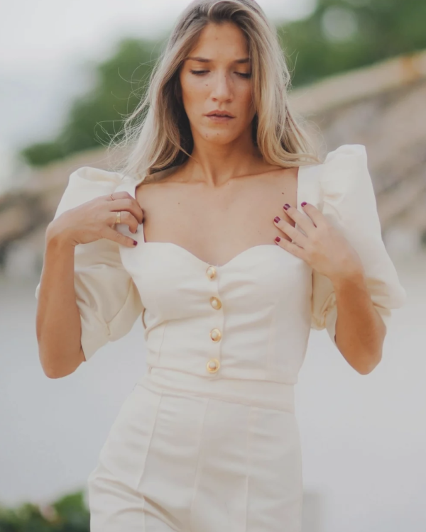 Una de las piezas clave de esta colección, el top blanco roto con escote corazón, mangas cortas abullonadas ideales tanto para el día como para la noche. Cierre de botones dorados y perlas.